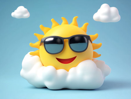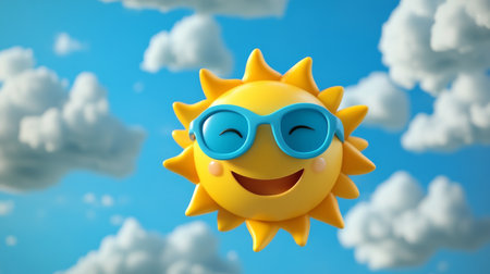 Smiling cartoon sun with blue sunglasses surrounded by fluffy clouds in bright blue sky. Cheerful and playful weather art concept
