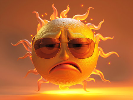 A sad, anthropomorphic sun with a frown and sunglasses, radiating orange and yellow light.