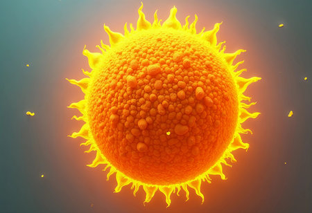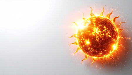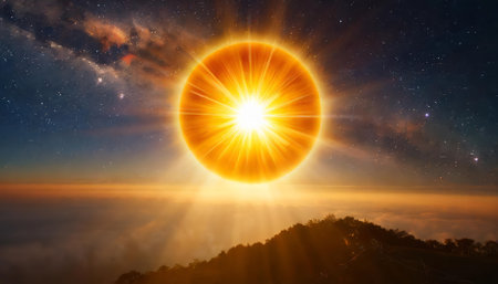Blazing sun emitting powerful rays of light, cosmic and high-energy scene.