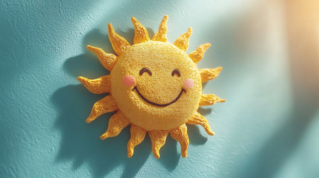Generative AI Image of Cute Sun with Happy Expression Sticking on Blue Wall