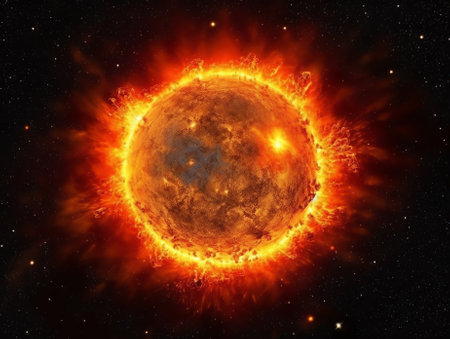 A detailed view of the Sun's fiery surface, showcasing active solar flares and prominences against a backdrop of deep space and stars.