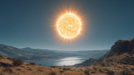 Hyper-realistic cinematic sun at noon, glowing fiercely in a clear sky, detailed rays illuminating the landscape below