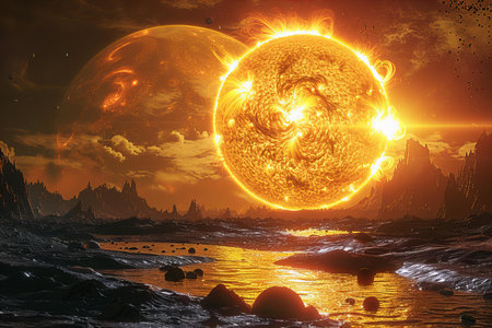 A colossal star erupts in a brilliant display of power, sending a massive solar flare across the void of space. Its intense heat and light wash over the horizon of a nearby planet, illustrating concepts of cosmic energy, climate change, and celestial events.