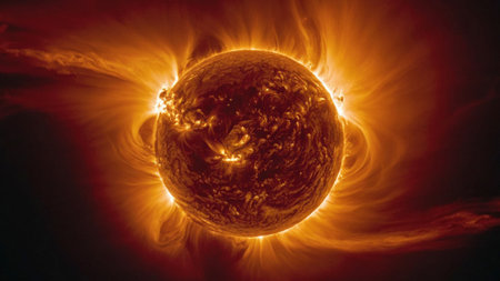 This high-resolution image captures the Sun in space with extraordinary detail, illustrating solar flares, magnetic fields, and coronal loops. A vivid portrayal of our stars immense energy and