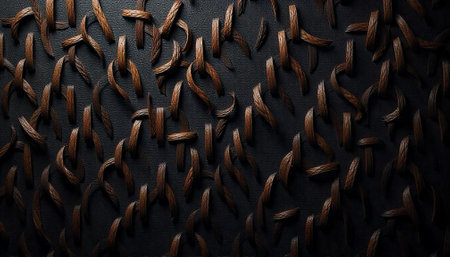 Abstract arrangement of intertwined brown pieces on black textured background