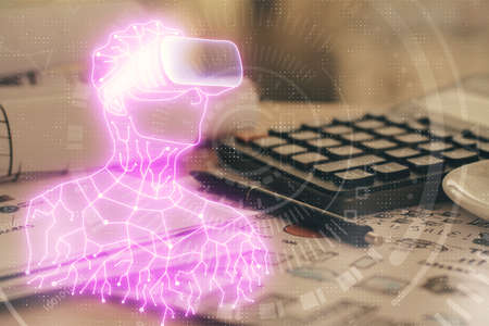 Double exposure of AR glasses drawing and work table top veiw. Concept of virtual reality.