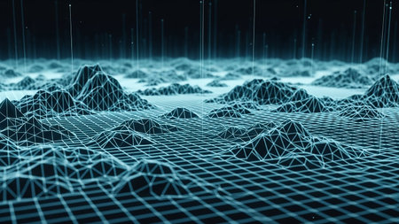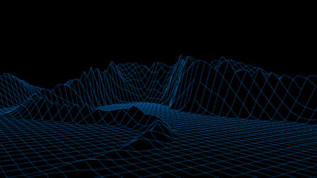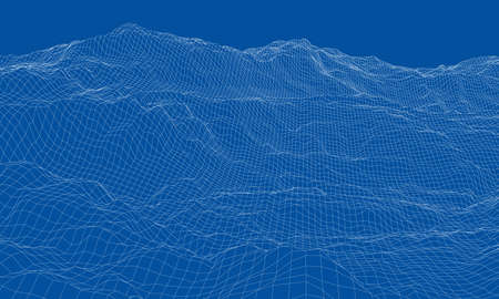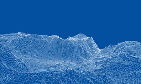 Abstract landscape of mountains and valleys in a wireframe style against a dark blue background
