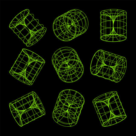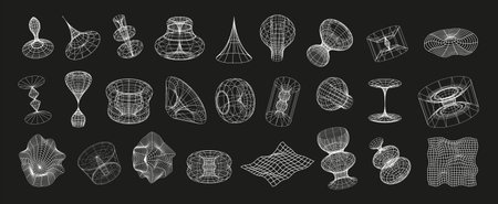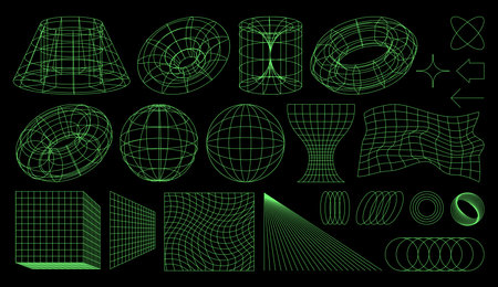 Set of Y2K elements, wireframes, 3d geometric shapes, grids, and linear forms inspired by brutalism, cyberpunk and retro futuristic styles. Vector geometric graphic aesthetic: torus, cube, sphere etc.