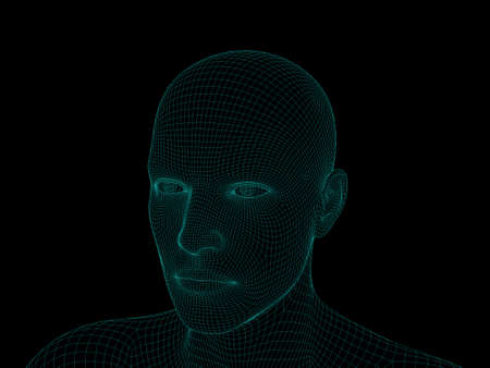 Wireframe human head. Isolated on black background. 3D rendering illustration.