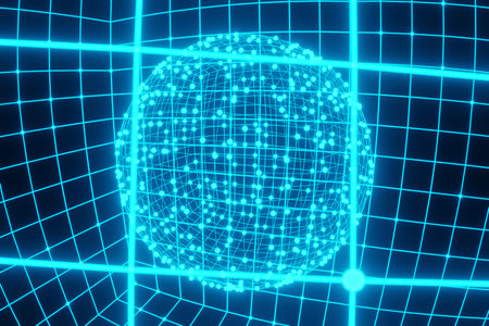 Digital showing infinite digital grid stretching into the distance with glowing blue lines and nodes against a dark background. resolution...