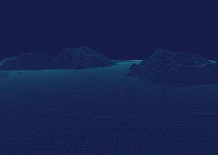 Abstract vector wireframe landscape background. 3D futuristic mesh mountains. 80s Retro illustration. Cyberspace technology valleys.