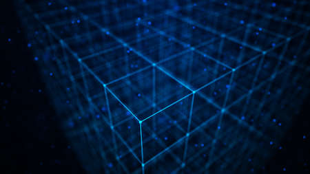 Digital blockchain concept and data transfer system. Abstract wireframe cube whith connection dots and lines. Storage cells of datas. 3d rendering.