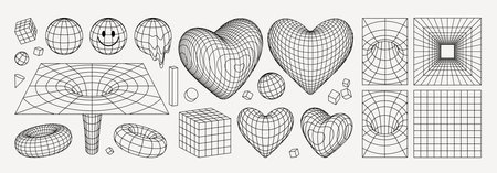 Abstract wireframe shapes set isolated on background. Vector illustration of 3D grid geometric icons, y2k mesh cube, globe, heart, cherry, pillar, star, cone, landscape structure, cyber space elements