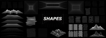 Wireframe lined shapes. Perspective mesh, 3d grid. Low poly geometric elements. Retro futuristic design elements, y2k, vaporwave and synthwave style. Vector illustration