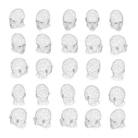 Set with a skeleton of a man's head in different positions from black lines isolated on a white background. The head turns fifteen degrees. Isometric view. 3D. Vector illustration.