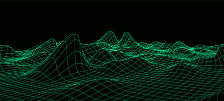 Technology perspective grid with mountain landscape background. Vector digital space wireframe landscape. green mesh on a black background