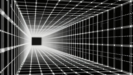 An intricate white wireframe cube structure with glowing lines extends into a dark void, creating a sense of depth and complexity against a black...