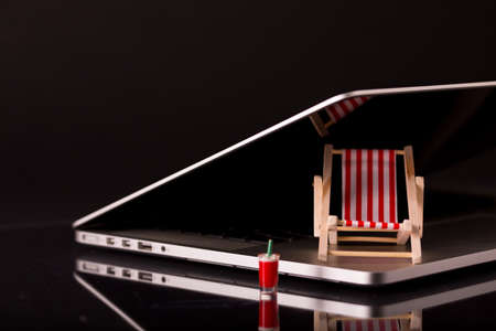 wooden model of the airplane on the background of a laptop, computer mouse, pen and notepad. business items in the office