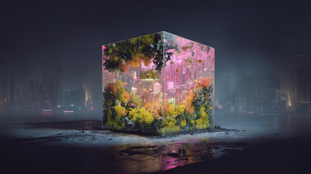 A translucent cube showcases an arrangement of plants and colorful foliage. The composition features vibrant pinks, yellows, and greens within a transparent structure, set against a blurred dark backdrop. The overall aesthetic suggests a digital art concept, suitable for design and conceptual applications. It implies the essence of nature within an urban environment.