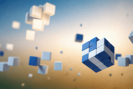 Abstract 3D render of blue and white cubes floating in a digital space. The cubes are arranged in a random pattern, creating a sense of depth and movement.