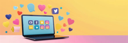 A close-up of an open laptop with social media icons on the screen, surrounded by colorful hearts against a bright yellow background.