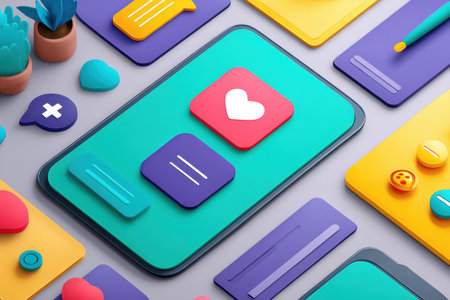 A vibrant 3D scene featuring colorful communication devices. This illustration showcases messages, icons, and gadgets in a playful arrangement against a bright yellow backdrop.