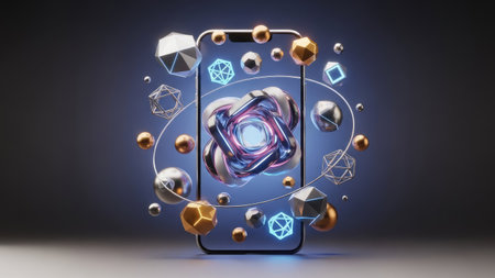 A digital illustration features a smartphone surrounded by floating geometric forms and orbs. Metallic silver and gold tones contrast against a dark backdrop with ethereal blue accents. The style suggests a futuristic, high-tech concept with a focus on design and digital elements suitable for commercial applications.