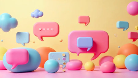 Colorful 3D chat bubbles with playful abstract elements on pastel background