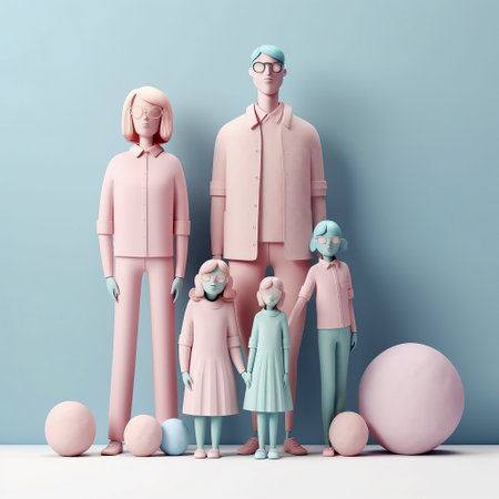 Three pixelated figures stand together on a blue background, creating a charming and simplistic image. The adult figure adds a touch of whimsy with a flower, suggesting a lighthearted and engaging visual.