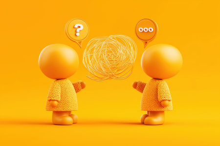 Two characters discuss a tangled mess between them, with one having a question mark, symbolizing the process of solving complex problems through dialogue.