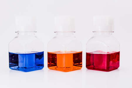 Chemical dye equipment and beakers in a fabric and industrial colouring cotton labratory factory. Dying fabrics for the fashion industry. Glass beakers and bottles.
