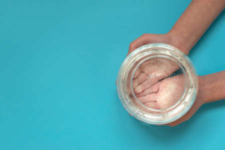 Hands holding aquarium with water on blue background. World environment day or water conservation concept