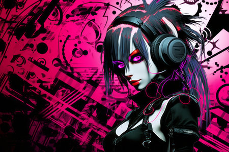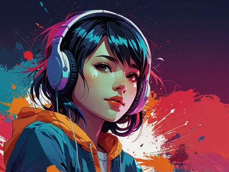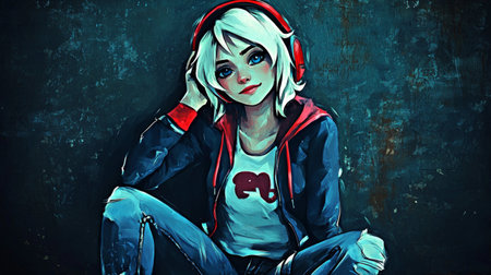 Anime girl listening music in gaming headphones AI