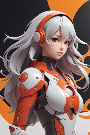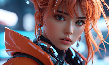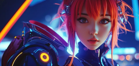 Portrait of a female cyborg with red hair. Futuristic cyberpunk style.