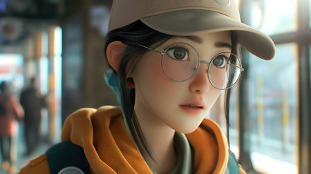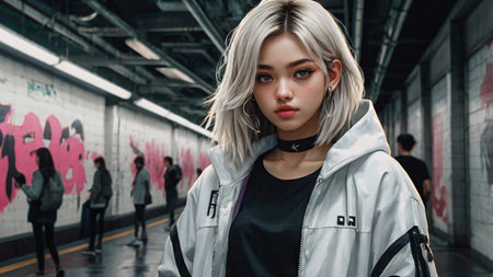 Beautiful japanese young girl waiting train in metro. Anime style art design. Elegant beautiful girl portrait