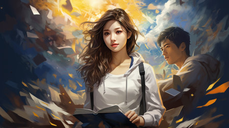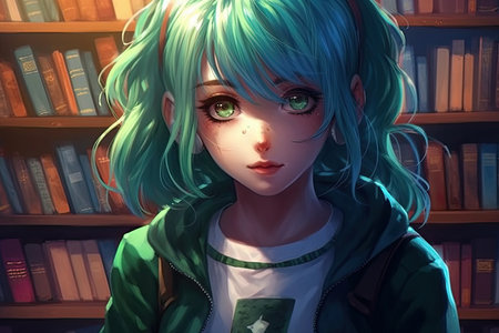 Illustration of an anime schoolgirl in library, generative ai