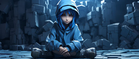 A digital 3D cartoon depiction of a teenager with blue hair, expressing feelings of sadness and isolation in a uniquely stylized environment.