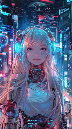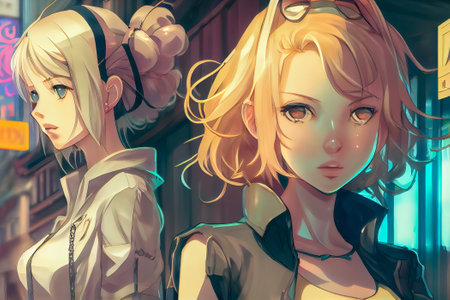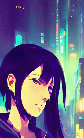 Cyberpunk anime streets illuminated with neon lights and holographic ads