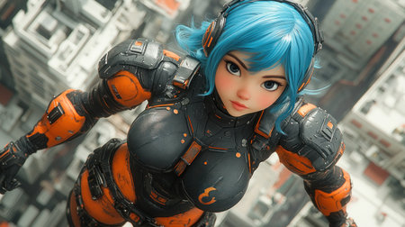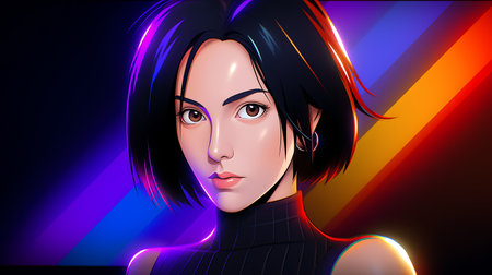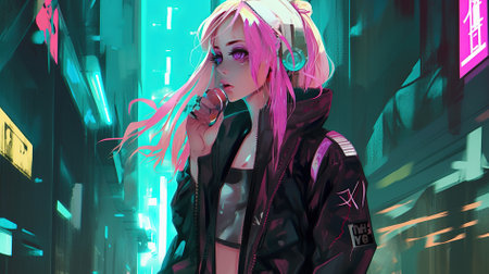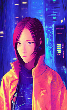 Digital art of a futuristic woman against a vibrant neon city backdrop. Generate AI
