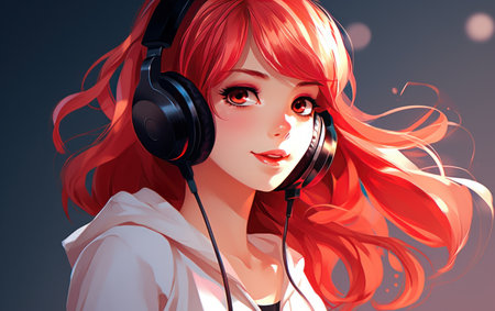 Anime girl with red hair listening music in gaming headphones AI