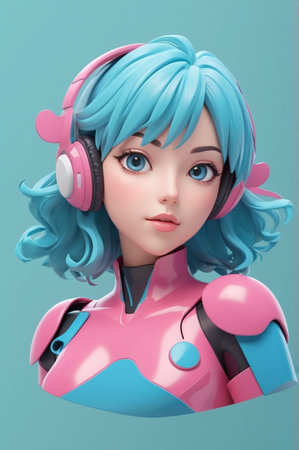 Cute girl with blue hair and headphones. 3d rendering.