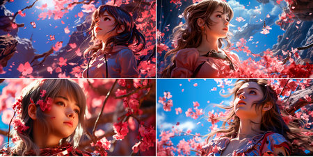 Character designs inspired by Japanese style and culture Intricate details bring the characters to life Soft cinematic lighting adds a touch of elegance and romance Cherry trees make a lovely backdrop