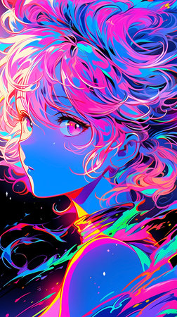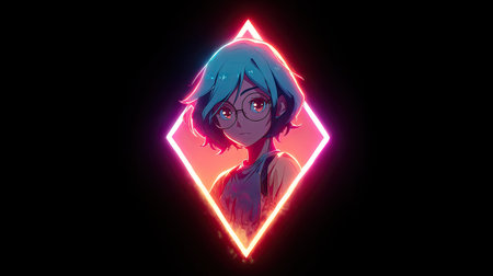 An anime-style character with blue hair and glasses is featured inside a vibrant neon diamond frame. The artwork displays a digital illustration with bold outlines and a focus on color and lighting. The background is a solid black, highlighting the illuminated character. This image could be used for various commercial or editorial purposes.