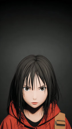 A character wearing a red hoodie displays a serious and intense look. The dark background highlights the emotion on the face, drawing attention to the expressive features.