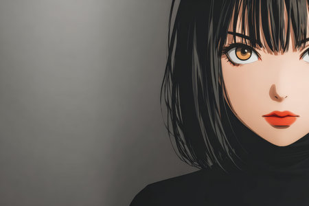 A character with a sleek black bob and bold makeup gazes confidently, set against a simple gray backdrop. The expression and style reflect a modern, edgy aesthetic.