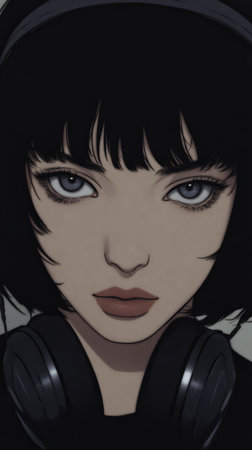 A young woman with a sleek bob haircut wears headphones and stares directly ahead. Her expression is serene, showcasing striking blue eyes and a simple backdrop.