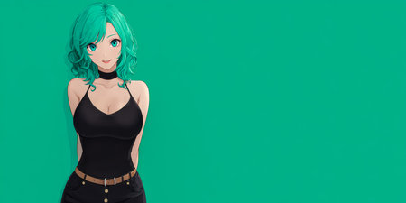 A young woman with vibrant teal hair stands confidently against a bright green backdrop. She wears a fitted black outfit and has a playful smile, exuding charm and energy.