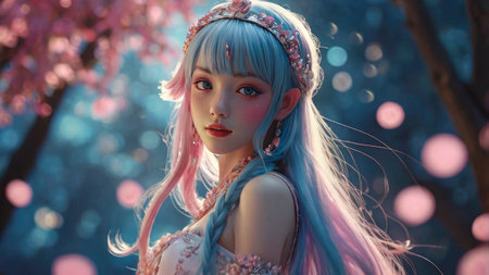 A serene fantasy girl with pastel blue and pink hair poses in a floral garden, creating a dreamy atmosphere Ideal for fantasy art.