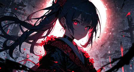 Anime-style character with dark hair in a ponytail, red glowing eyes, wearing a black and red outfit adorned with floral designs