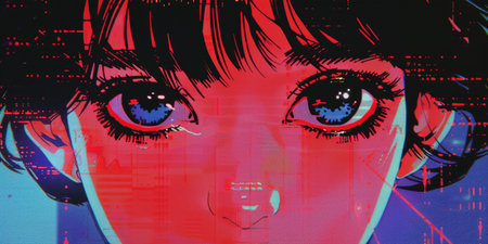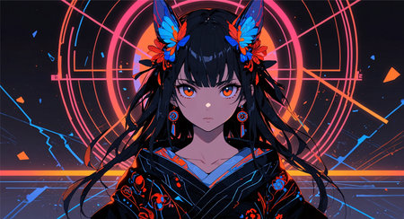 A digital anime-style girl with glowing orange eyes and long black hair, wearing a black and red outfit decorated with blue and red patterns